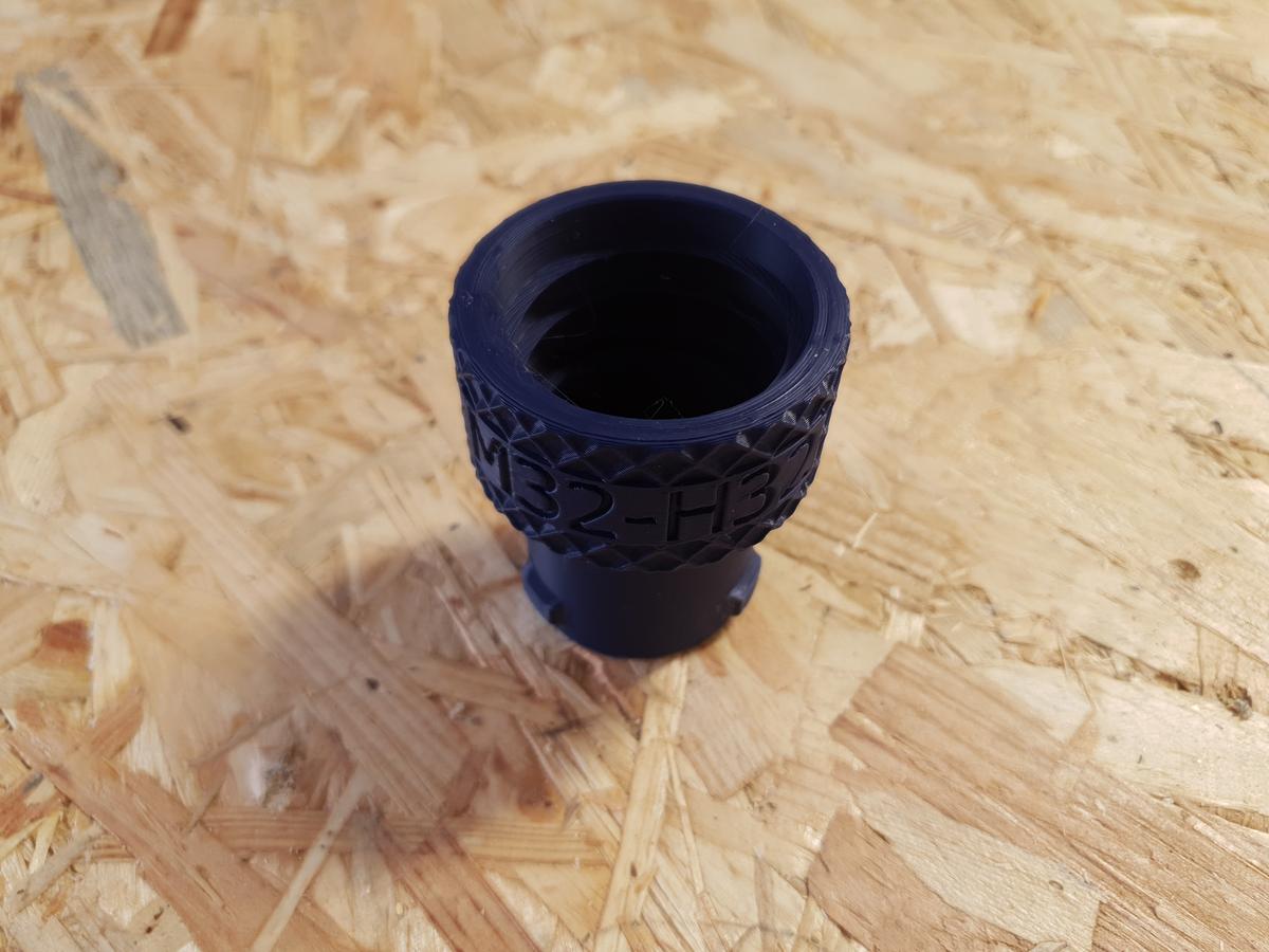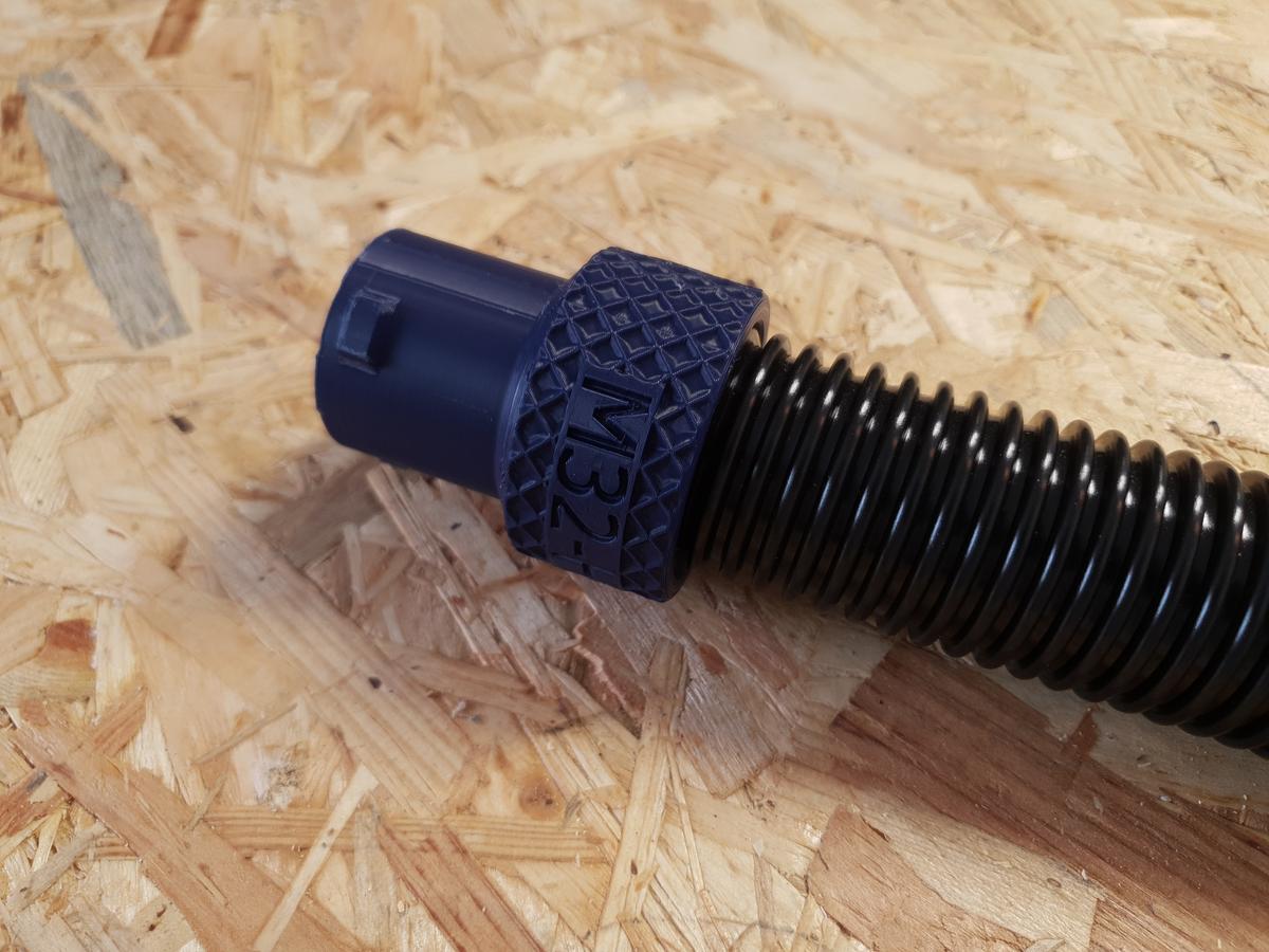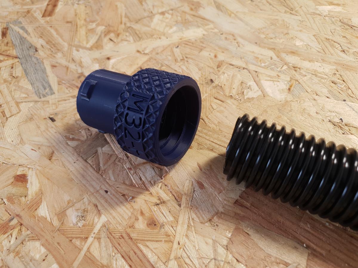 Der M32-H32 besitzt auf der einen Seite den Anschluss für deinen handelsüblichen Staubsaugerschlauch mit 32 mm Innendurchmesser und ca. 40 mm Außendurchmesser. Auf der anderen Seite bietet er den passenden Steckanschluss für den F32-H32 oder andere osVAC-Adapter.